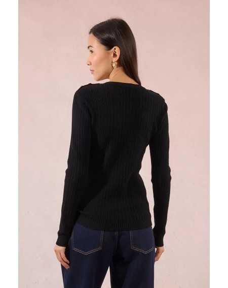 Ce pull fin en maille torsadée mise sur une coupe ajustée et une texture travaillée pour un look à la fois confortable et raffiné. L'encolure ronde et la patte d'épaule ornée de boutons contrastés lui apportent une touche originale, idéale pour structurer la silhouette avec subtilité.