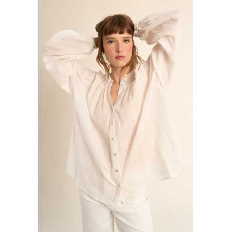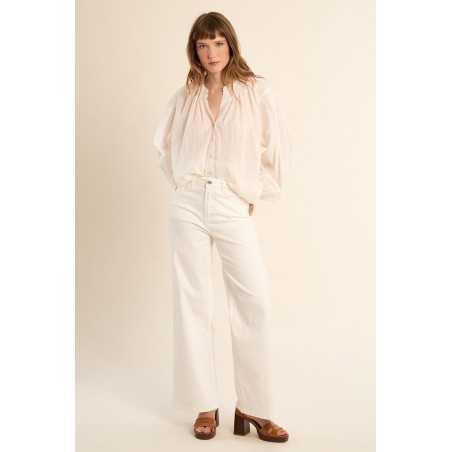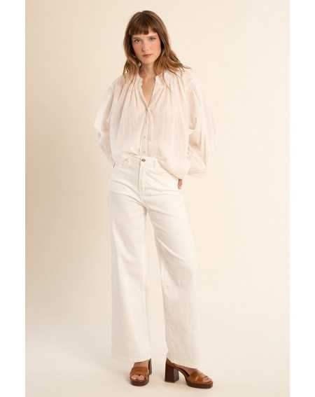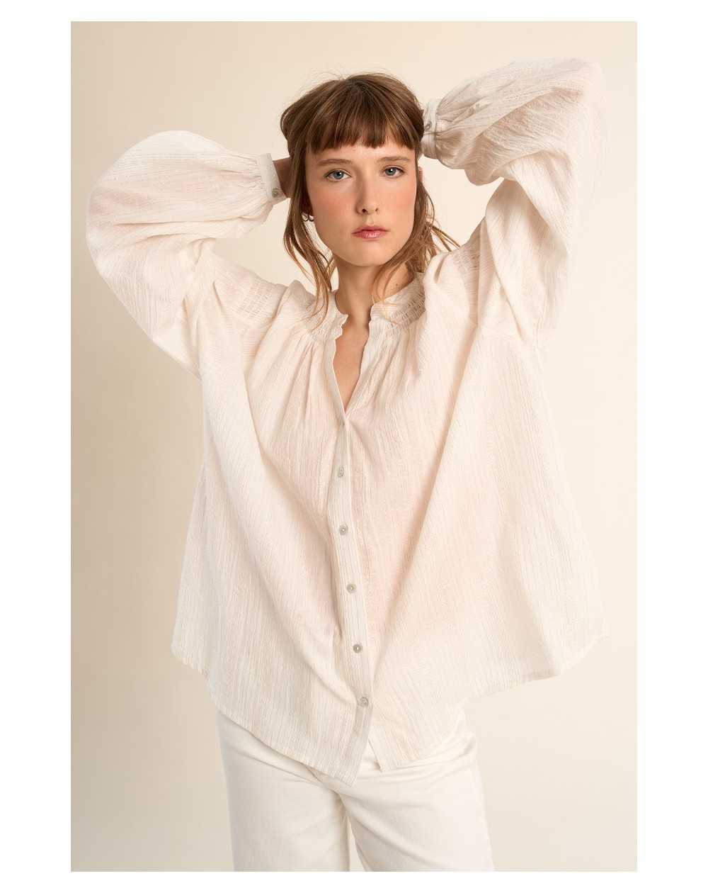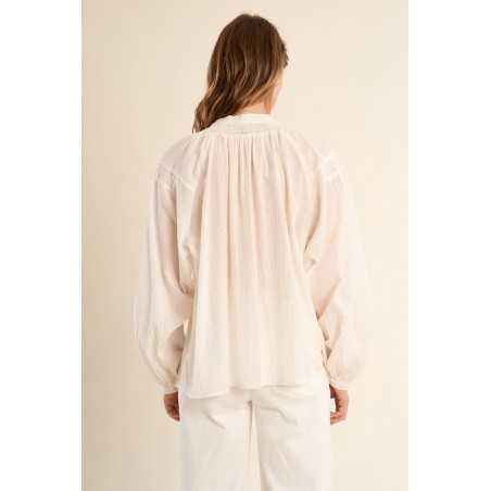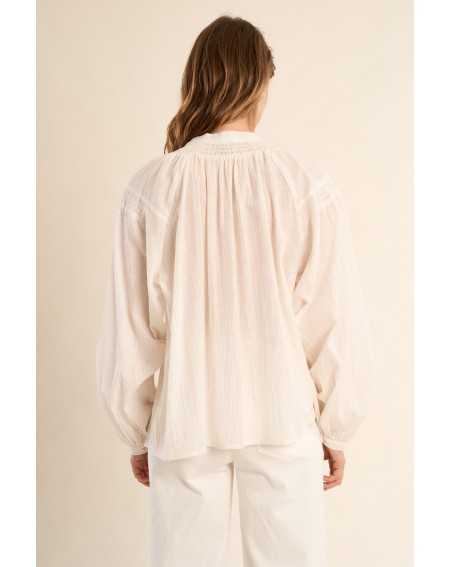 Blouse en coton à col mao, à l’allure douce et élégante. Sa coupe large et ses détails volantés apportent confort et féminité.
