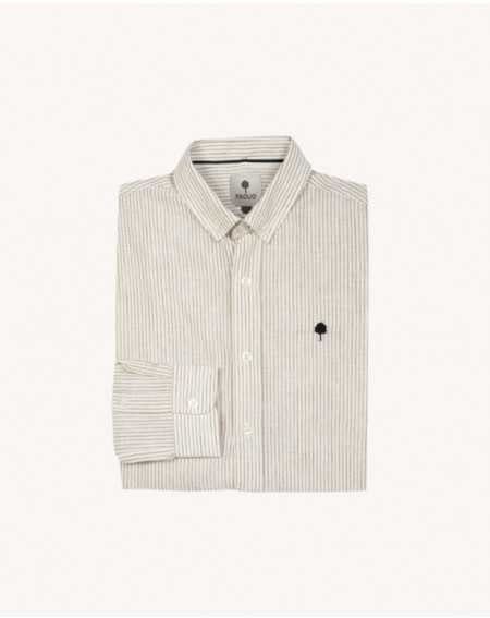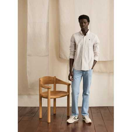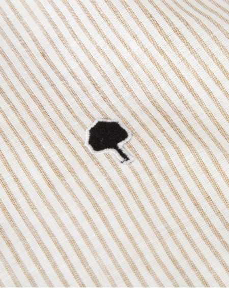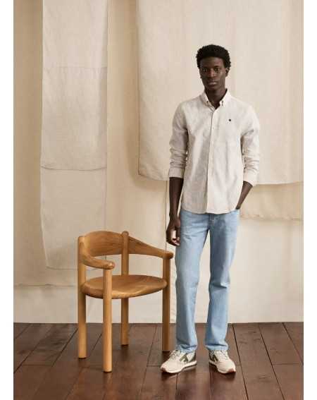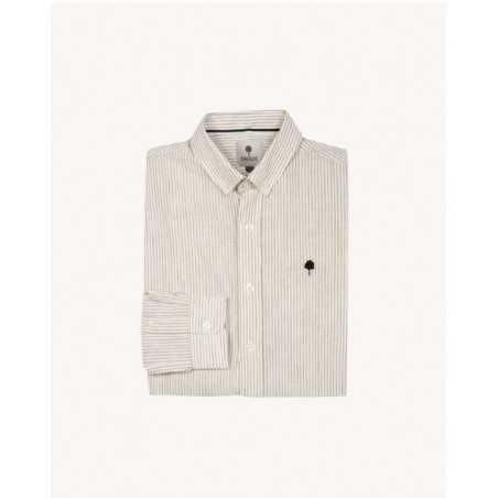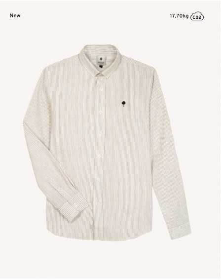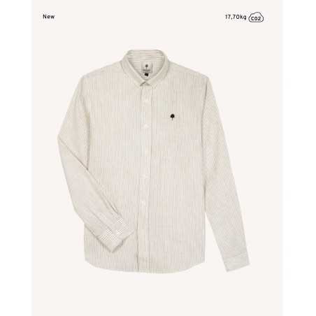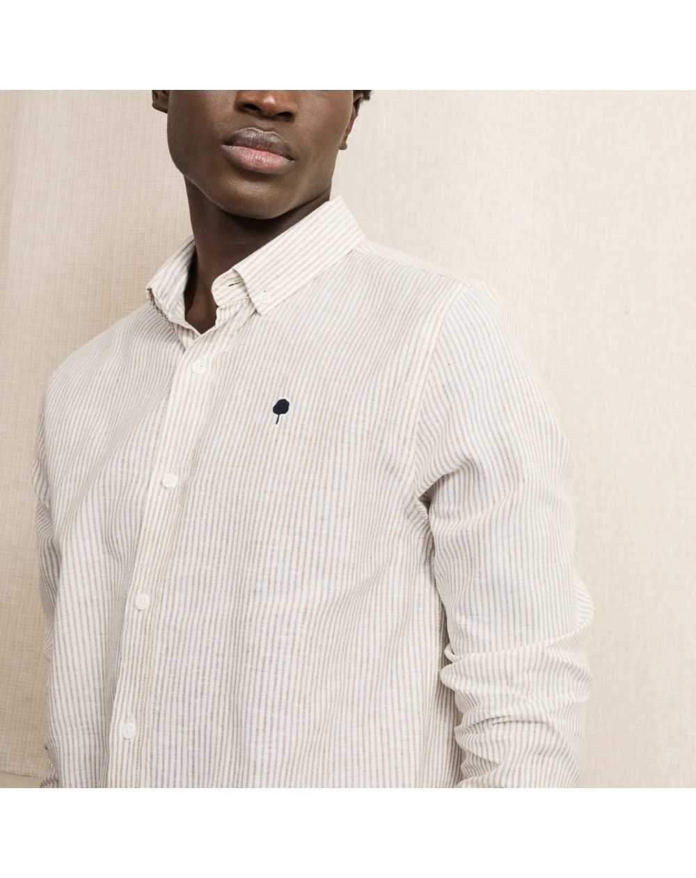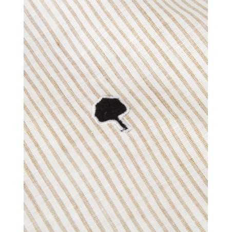 La chemise en lin homme crème et beige clair IVOY est idéale pour la saison estivale. Sa toile rayée en mélange coton et lin offre légèreté et respirabilité. Le col boutonné et la coupe droite assurent un porté soigné, tandis que la broderie arbre signe discrètement la pièce.