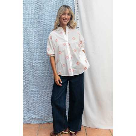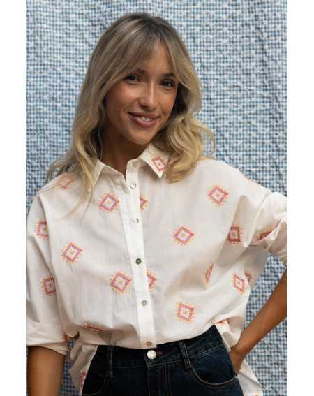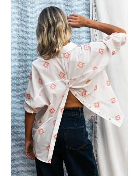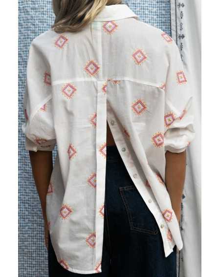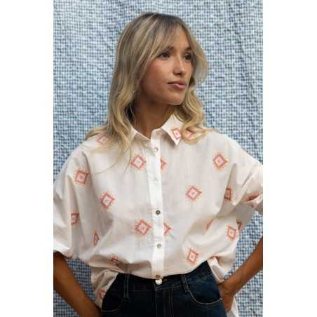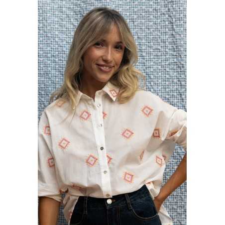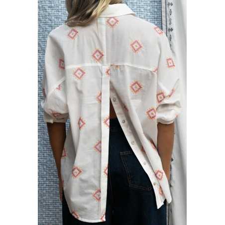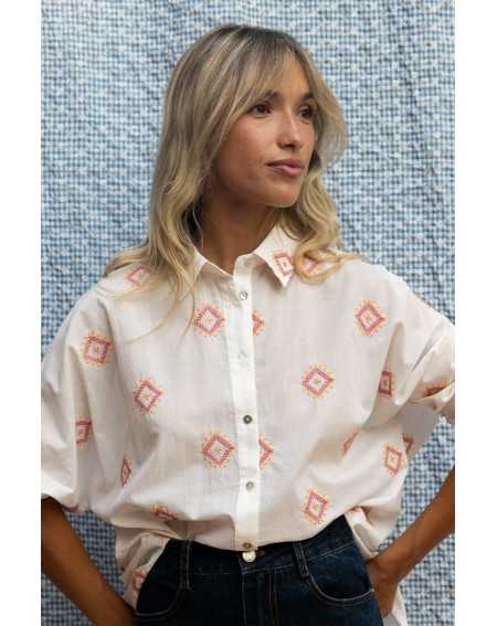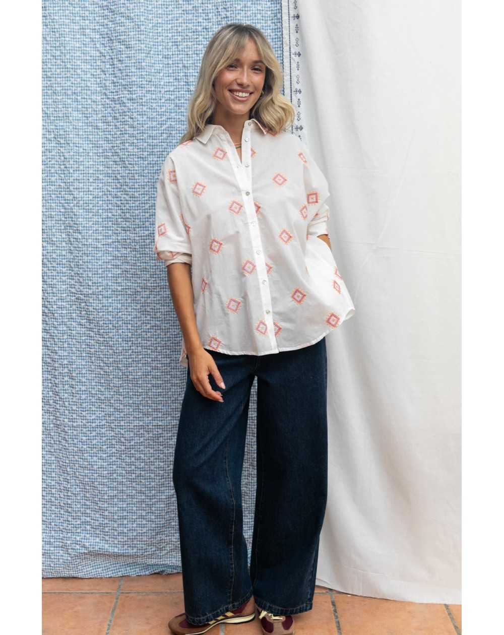 La broderie Pueblo, graphique et colorée, apporte du rythme à la pièce sans la surcharger. C’est une chemise qu’on porte rentrée, sortie, boutonnée ou entrouverte, et qui donne immédiatement du caractère à un jean ou un pantalon plus simple.