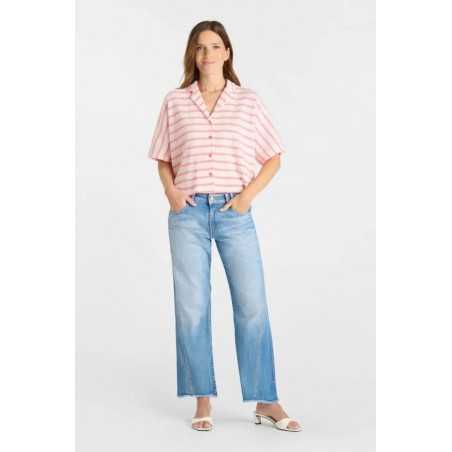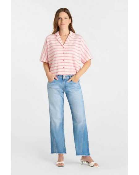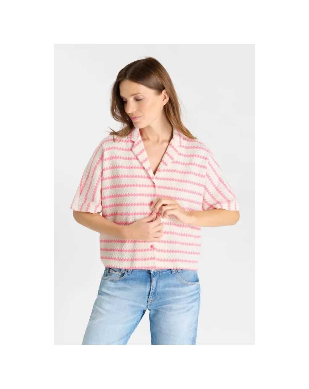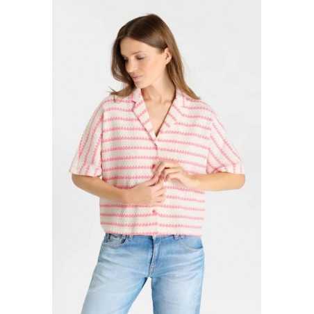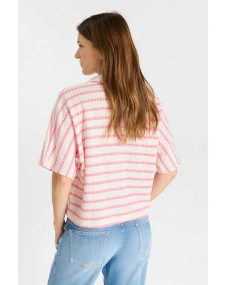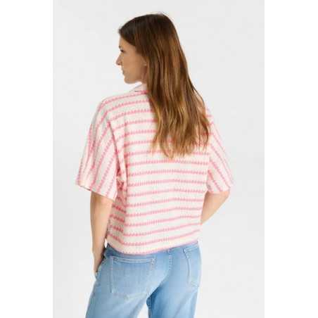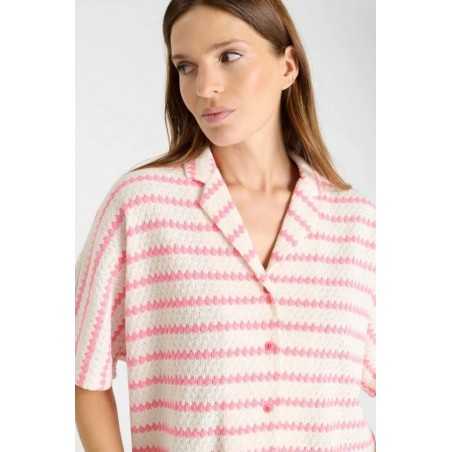 Chemise ample en maille rayée rose et écrue.