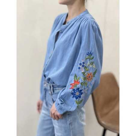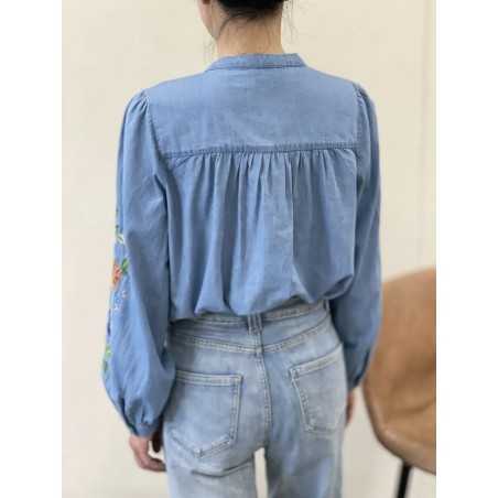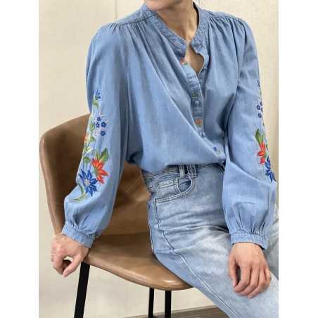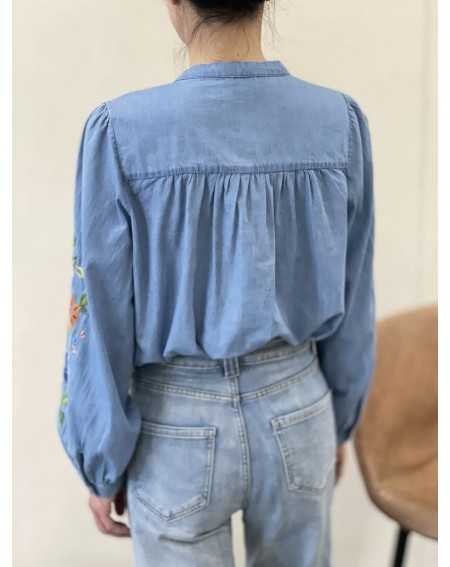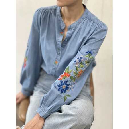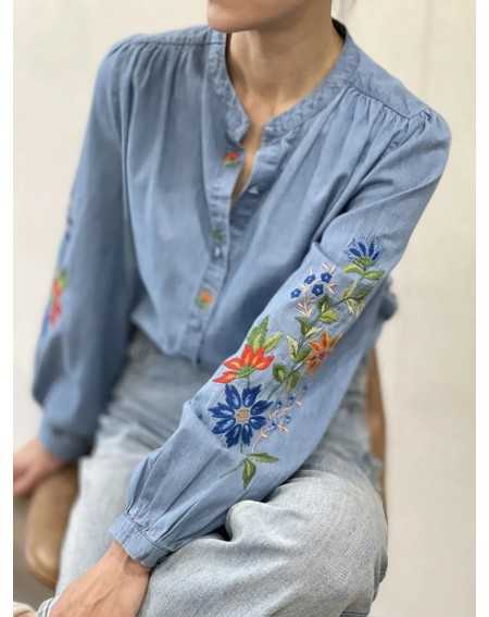 - Chemise en jeans col mao, avec broderie fleurs sur les manches.