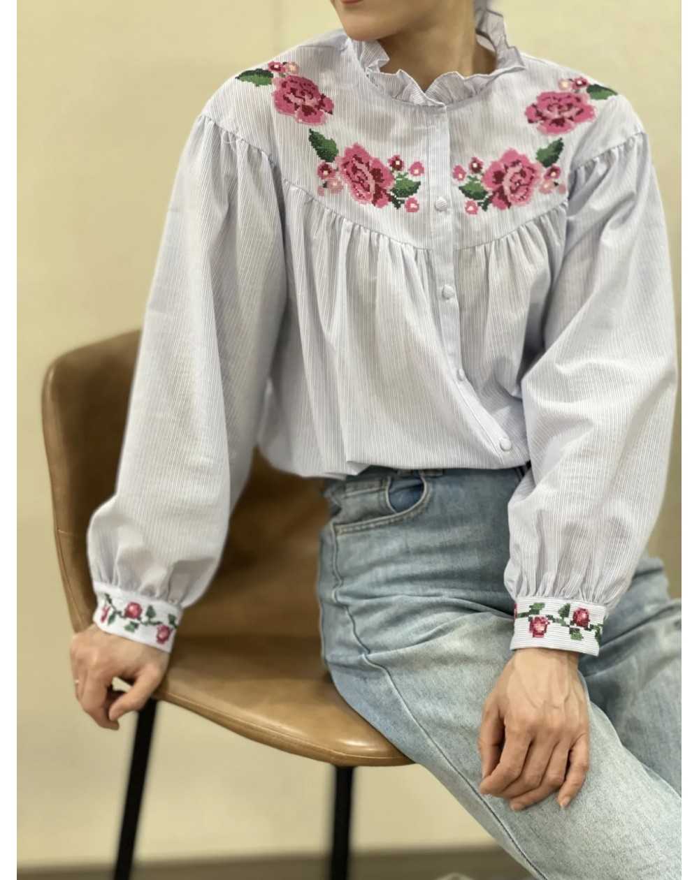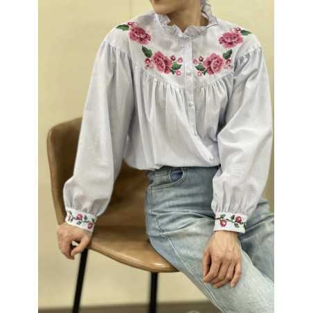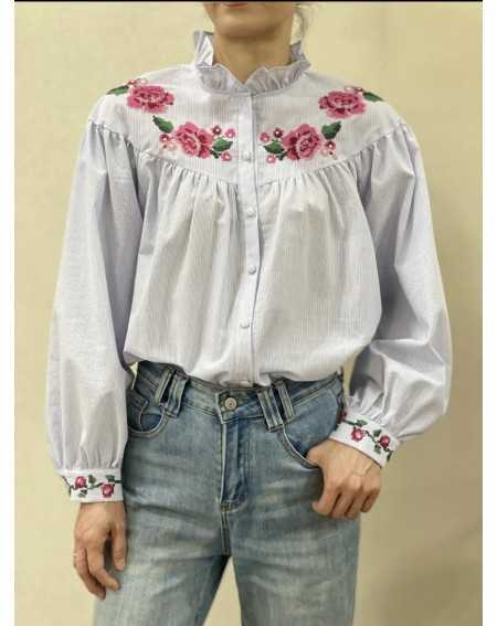 - Chemise col froncé avec broderie fleurs en collier et bout des manches.