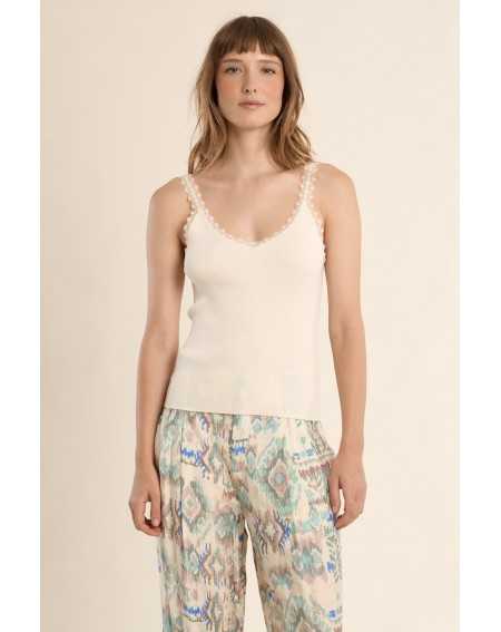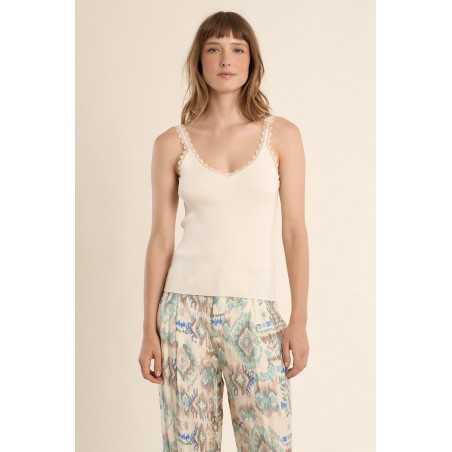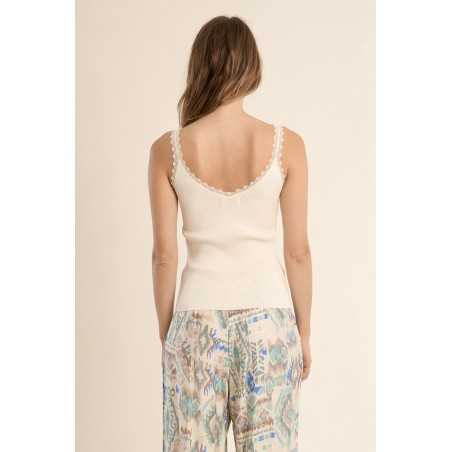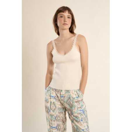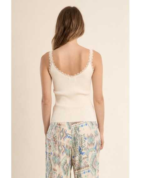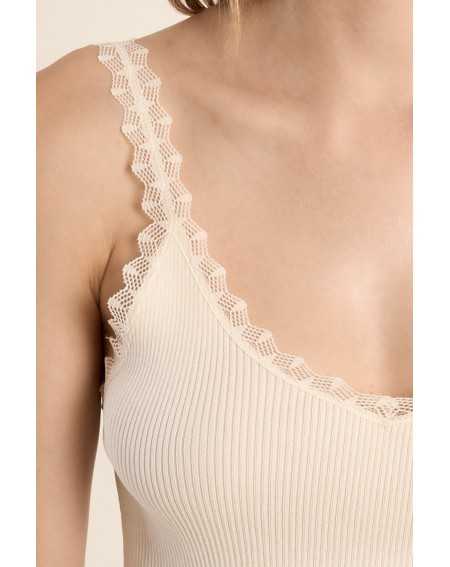 Débardeur en maille côtelée à l’allure délicate et féminine. Ses fines bretelles et ses finitions en dentelle apportent une touche raffinée.