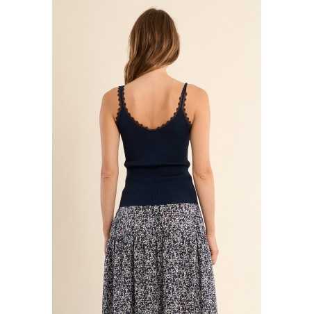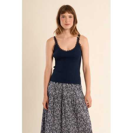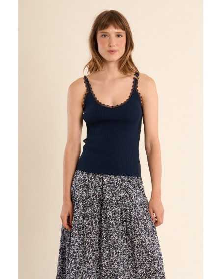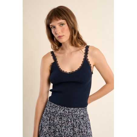 Débardeur en maille côtelée à l’allure délicate et féminine. Ses fines bretelles et ses finitions en dentelle apportent une touche raffinée.