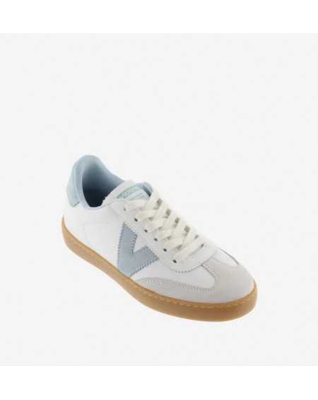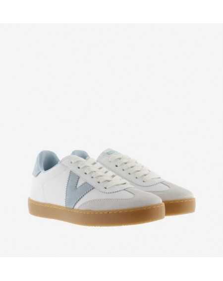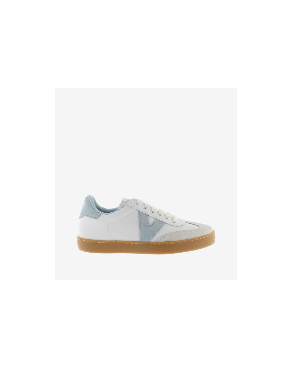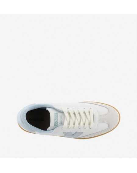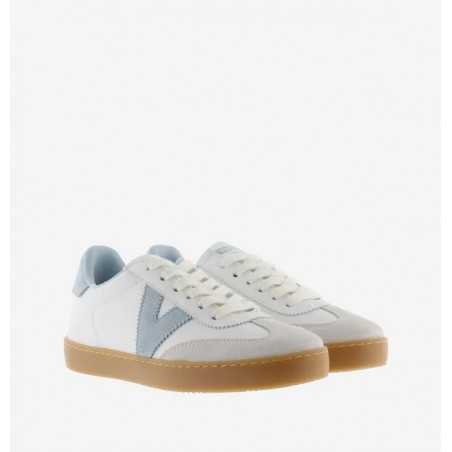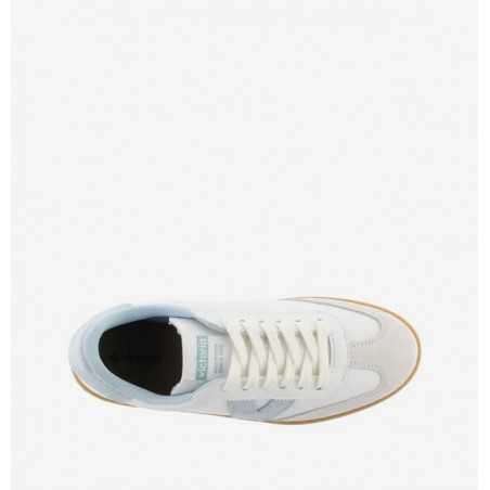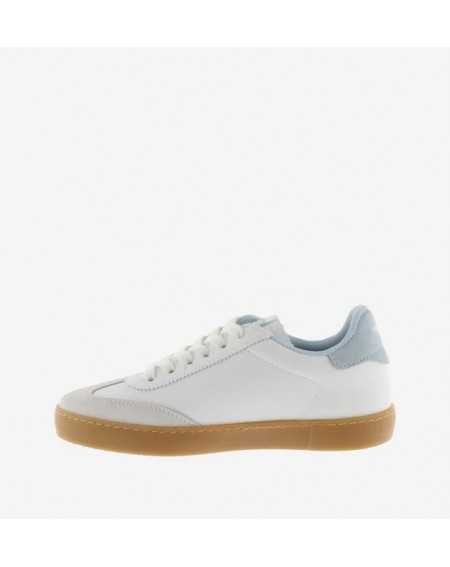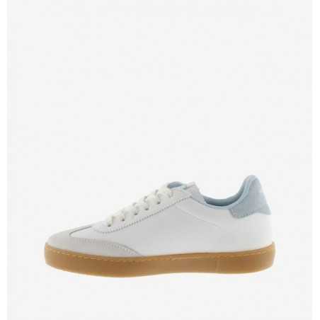 Baskets pour femme au design épuré et moderne, fabriquées en Espagne. L’association de l’effet cuir blanc, du cuir velours et de la semelle translucide caramel apporte une allure tendance et facile à porter au quotidien.