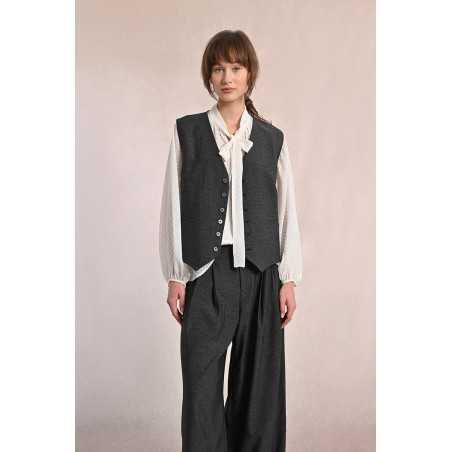 Élégant et moderne, ce veston sans manches revisite les codes du tailoring avec une allure affirmée. Sa coupe oversize, ses pinces structurantes et sa large encolure V apportent du caractère à vos silhouettes. À porter seul ou superposé, il s'adapte aussi bien à un look de bureau qu'à une tenue plus décontractée.