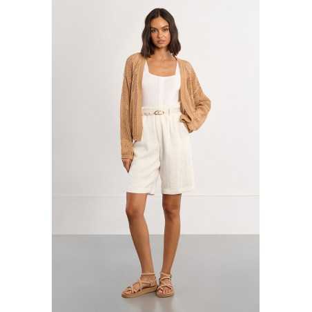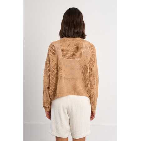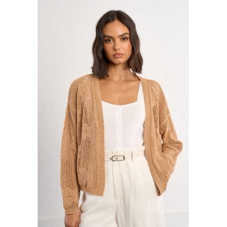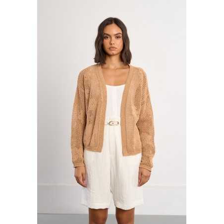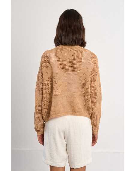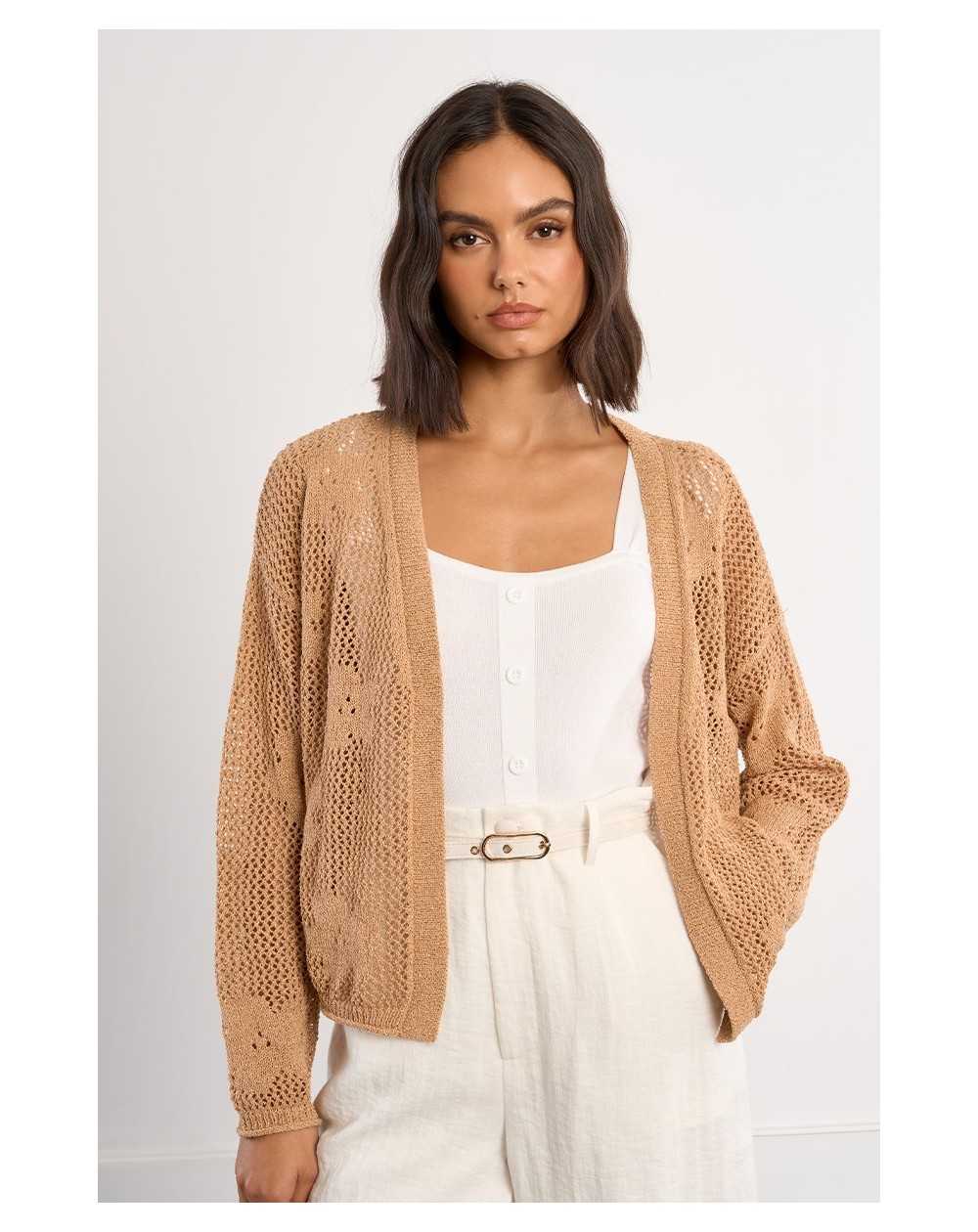 Cardigan en maille fine à l’allure délicate, rehaussé de détails fleurs. Sa coupe décontractée et son porté ouvert en font une pièce facile à superposer.