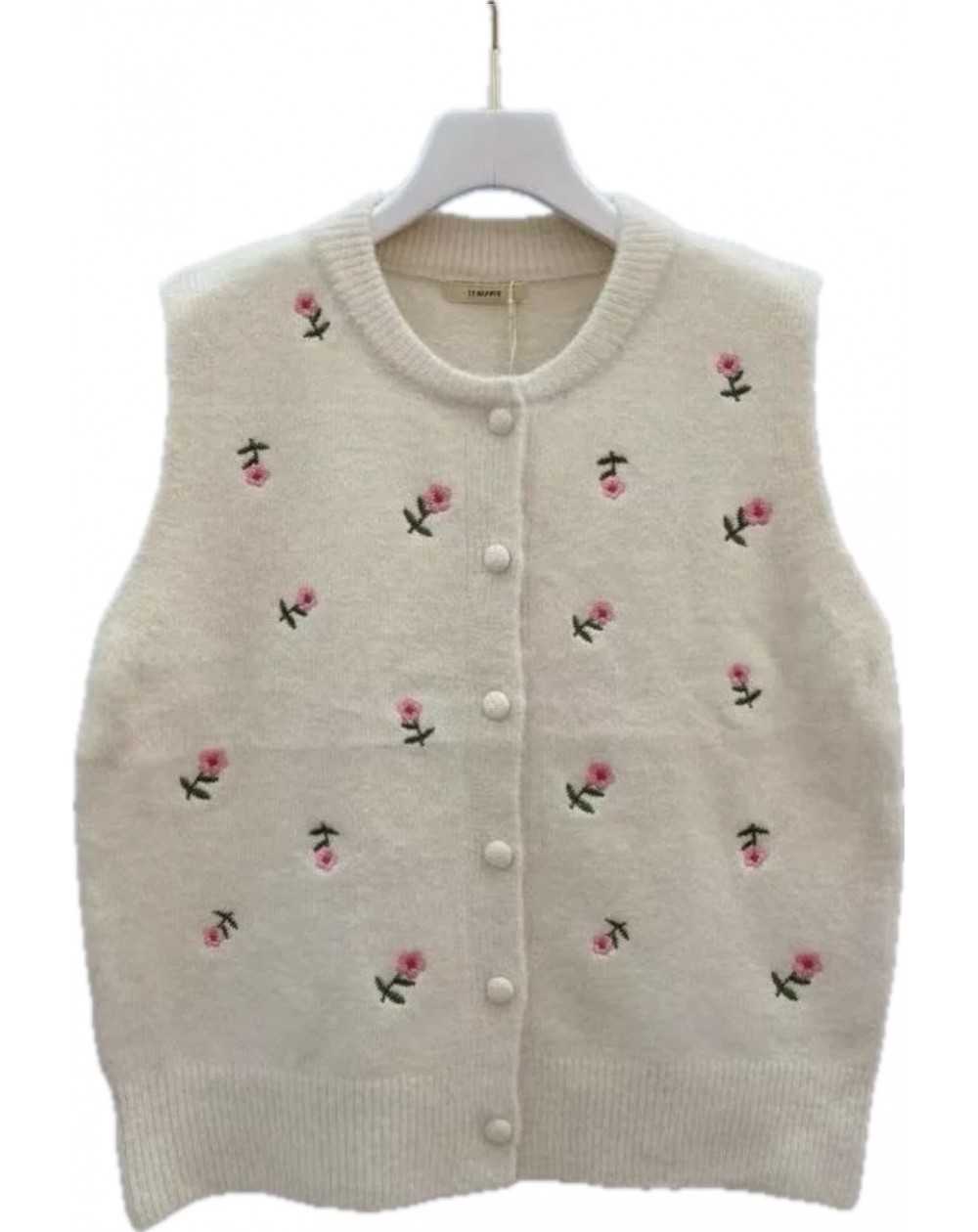 - Gilet sans manches bouton ton sur ton, avec broderie de fleurs