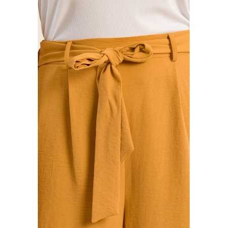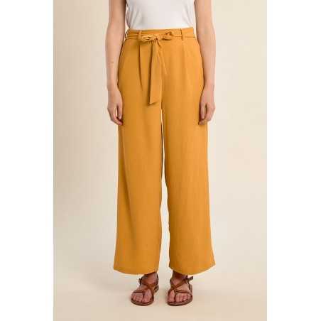 Pantalon fluide à l’allure élégante et confortable. Sa taille haute plissée, soulignée par un lien à nouer, structure la silhouette tout en restant facile à porter.