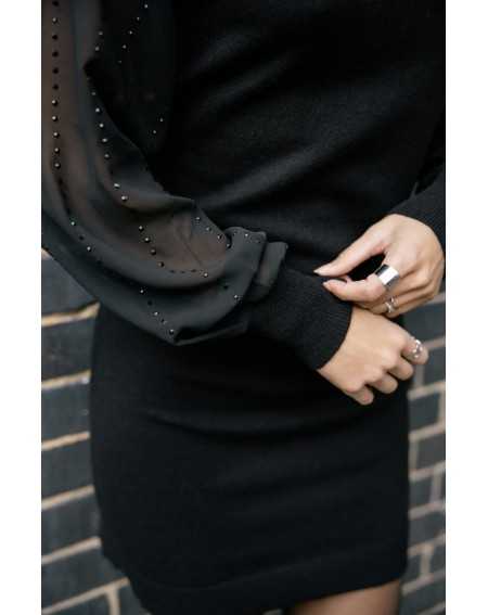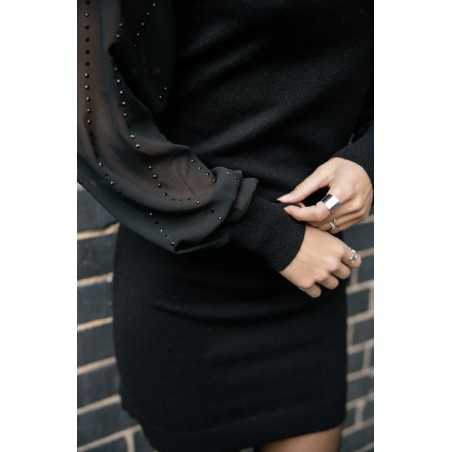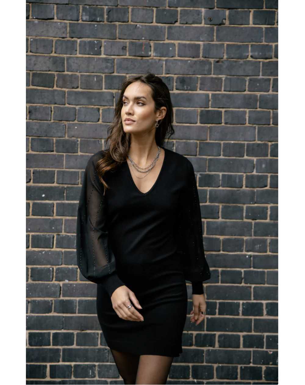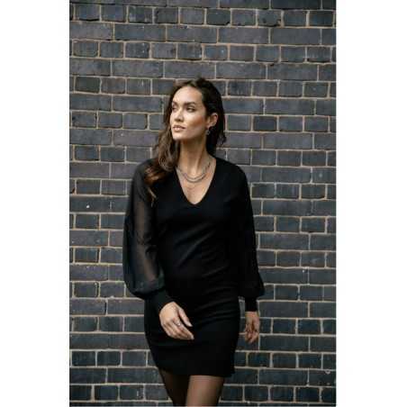 Robe bi-matière élégante en maille noire à point jersey, sublimée par des manches bishop en voile légèrement transparent à rayures strass noires. Son encolure en V et ses finitions bord-côtes soulignent une coupe près du corps à longueur mi-cuisse.