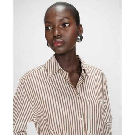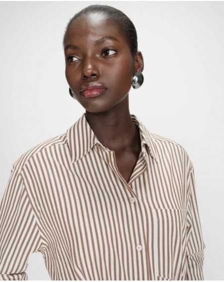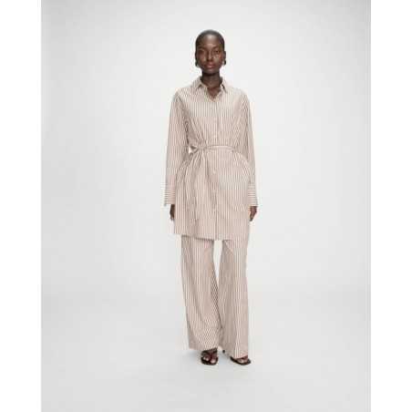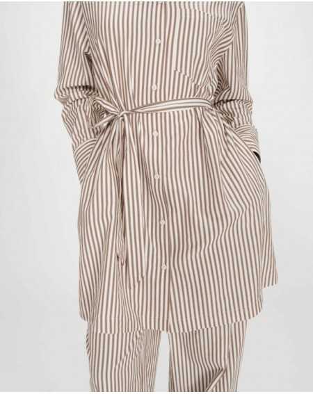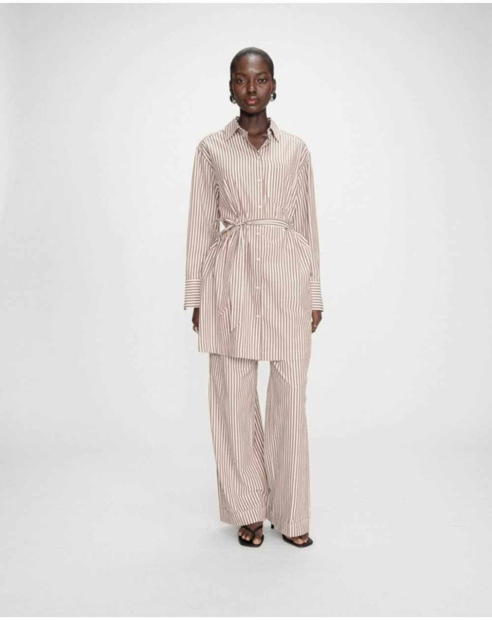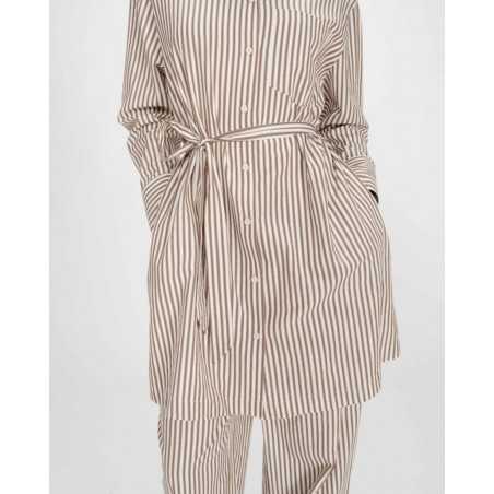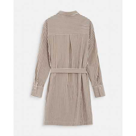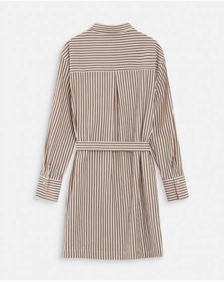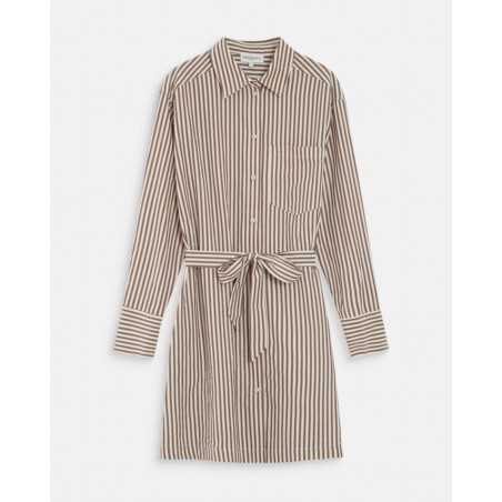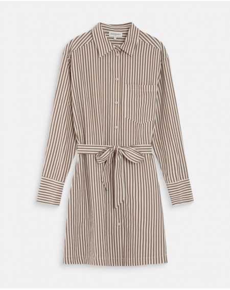 VISERY est une robe chemise courte à rayures, dotée de manches longues et d'une ceinture amovible à la taille.Sa poche plaquée sur la poitrine et sa coupe droite structurent la silhouette avec simplicité.