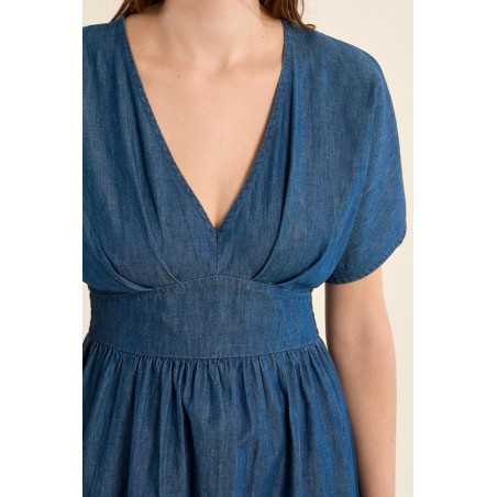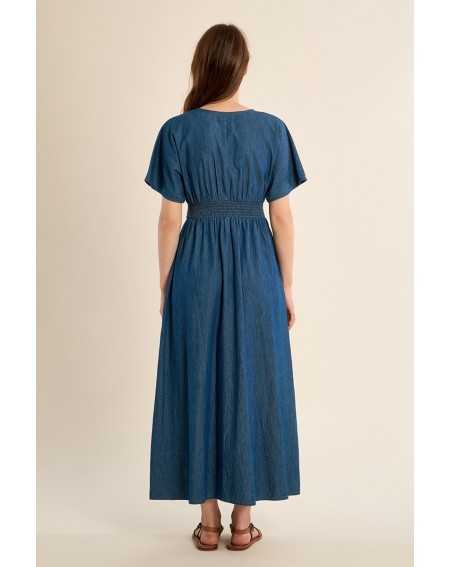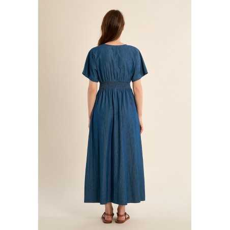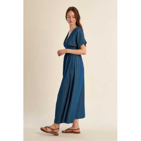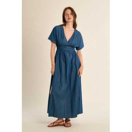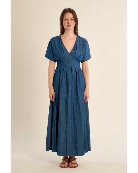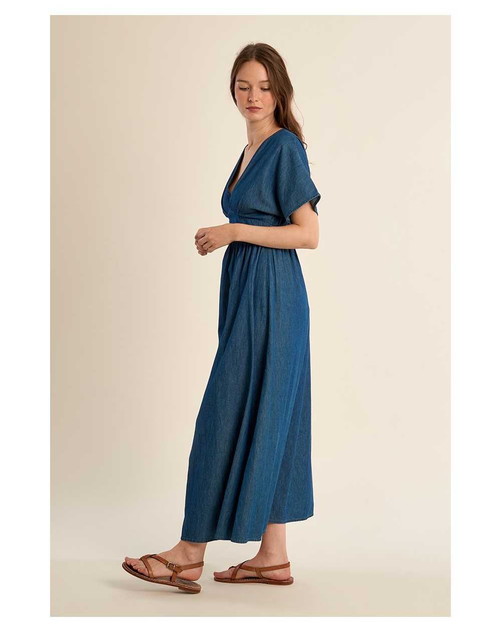 Robe longue à l’allure fluide et féminine. Son décolleté en V, ses manches chauve-souris et sa taille resserrée structurent la silhouette avec élégance.