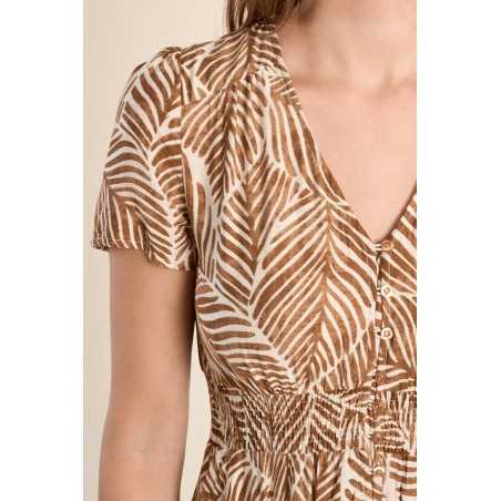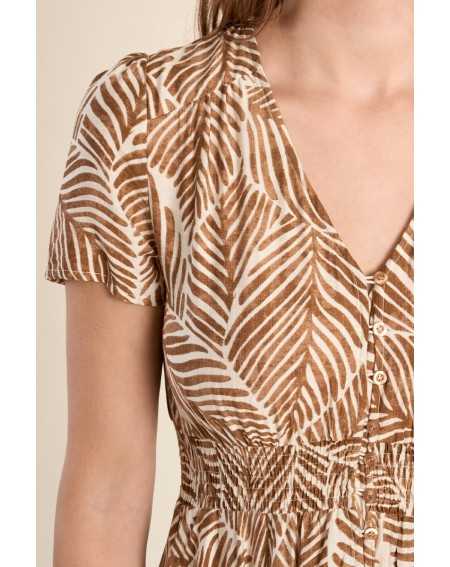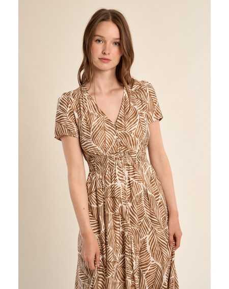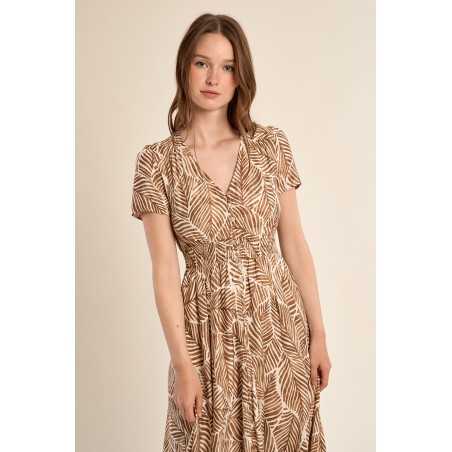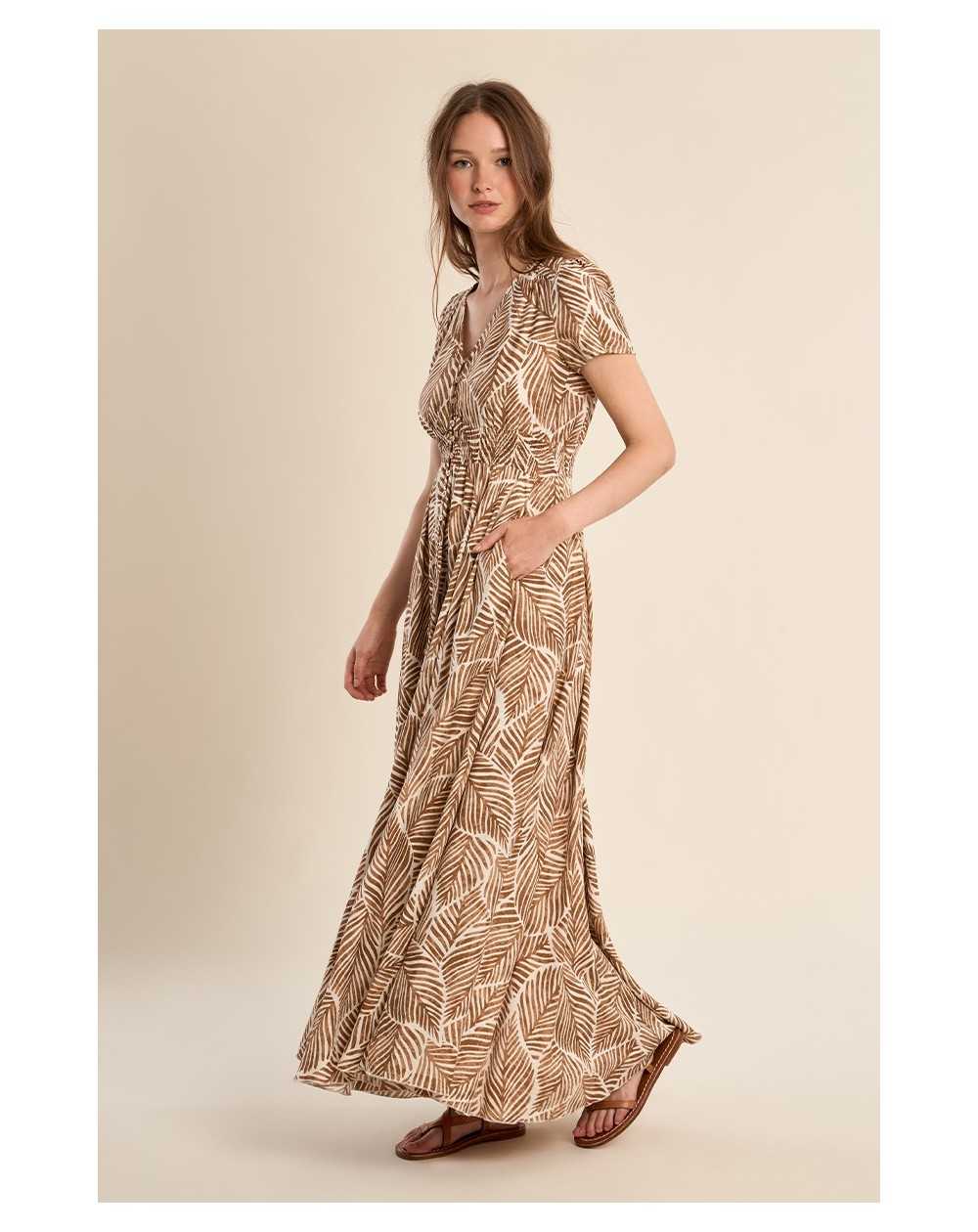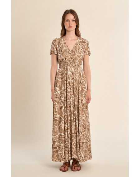 Robe longue imprimée à l’allure fluide et féminine. Son encolure en V et sa taille élastiquée offrent confort et élégance au quotidien.