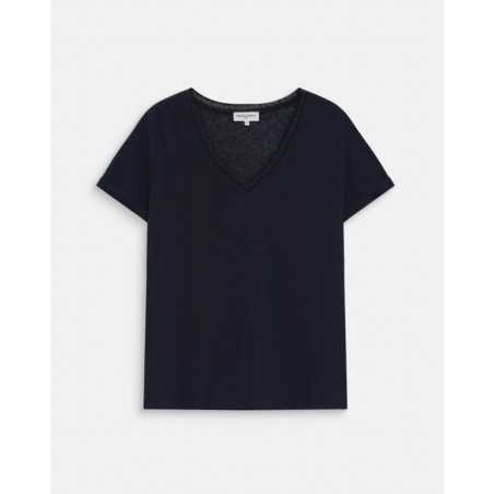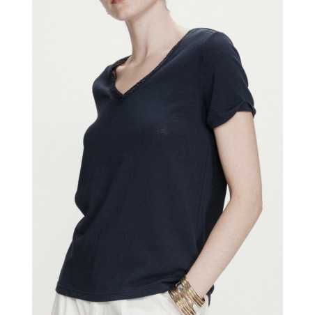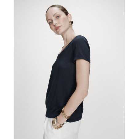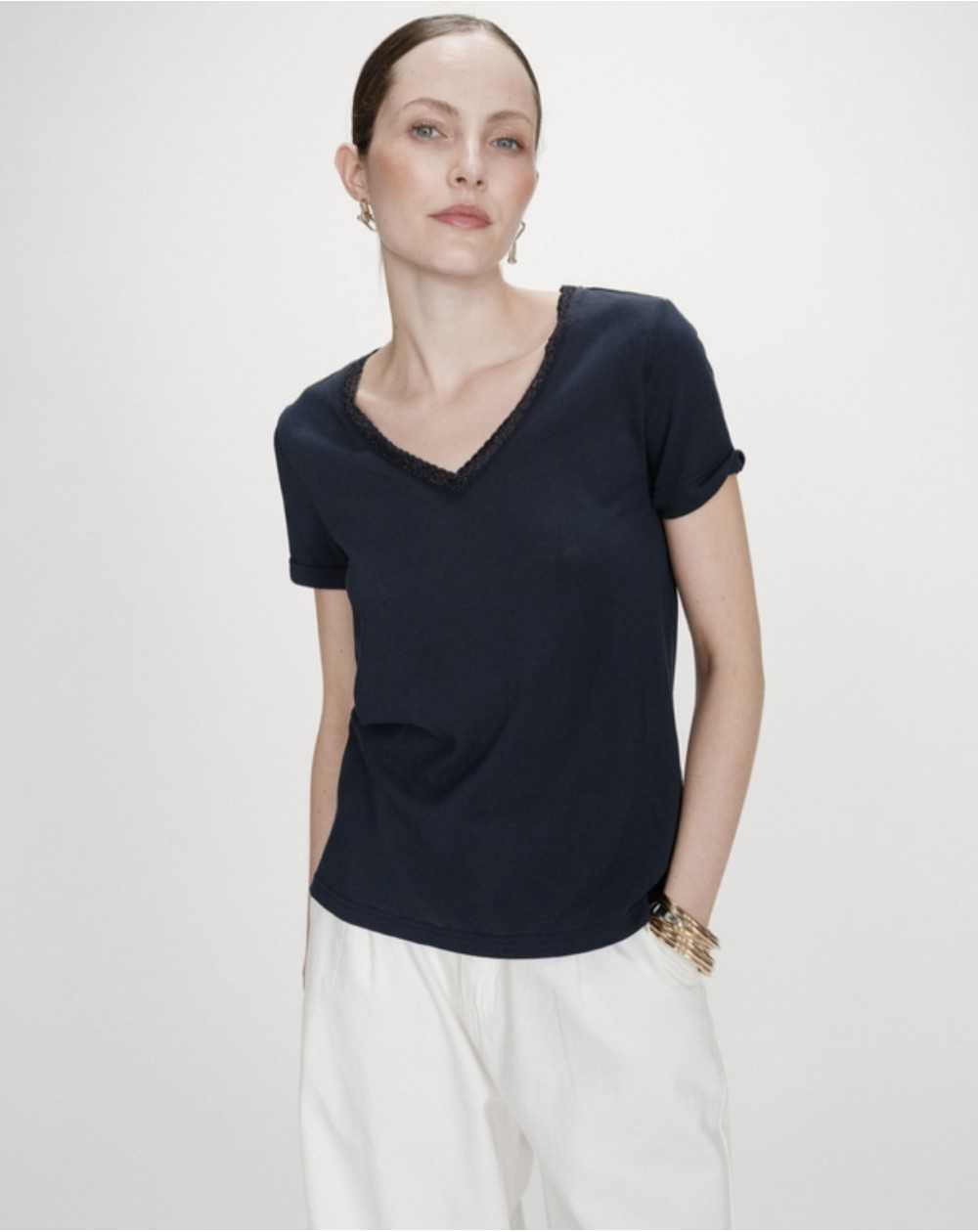 -shirt emblématique de G&M, pensé comme un essentiel du vestiaire.Il se distingue par son encolure en V soulignée de lurex et ses manches courtes à revers, pour une touche discrète et raffinée.