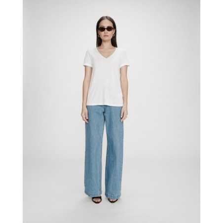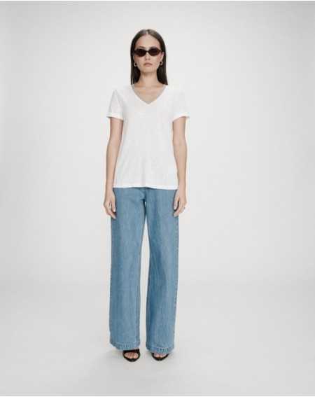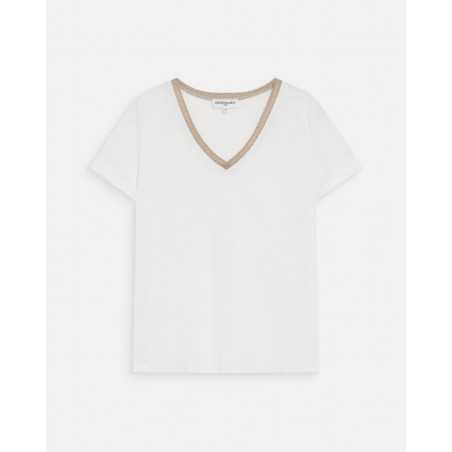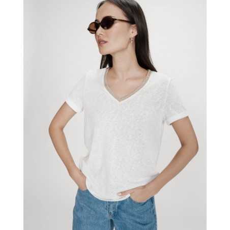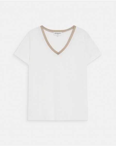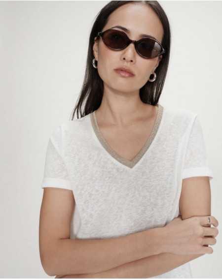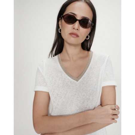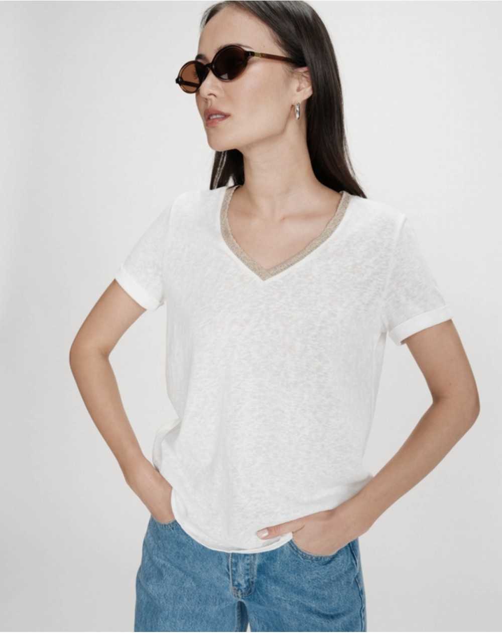 -shirt emblématique de G&M, pensé comme un essentiel du vestiaire.Il se distingue par son encolure en V soulignée de lurex et ses manches courtes à revers, pour une touche discrète et raffinée.