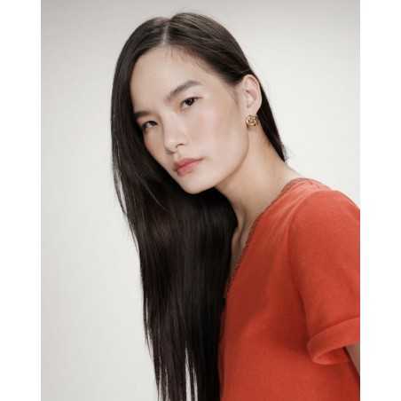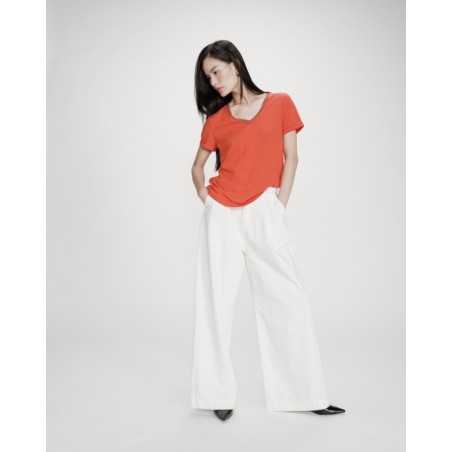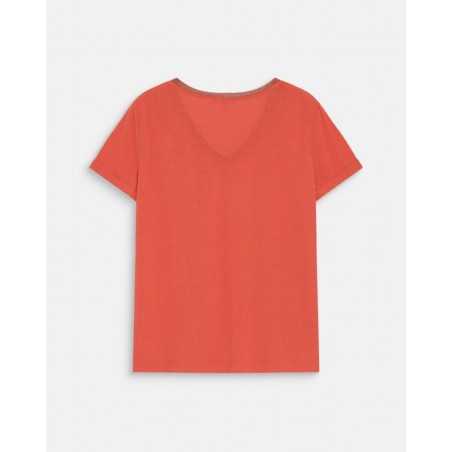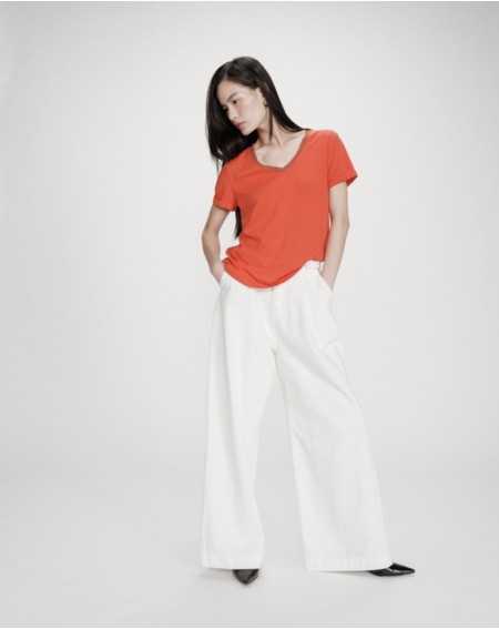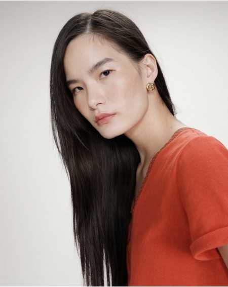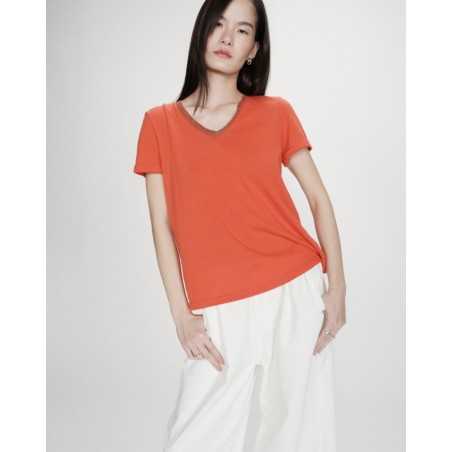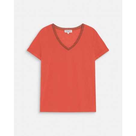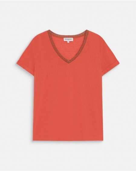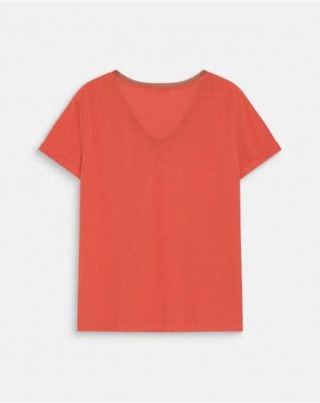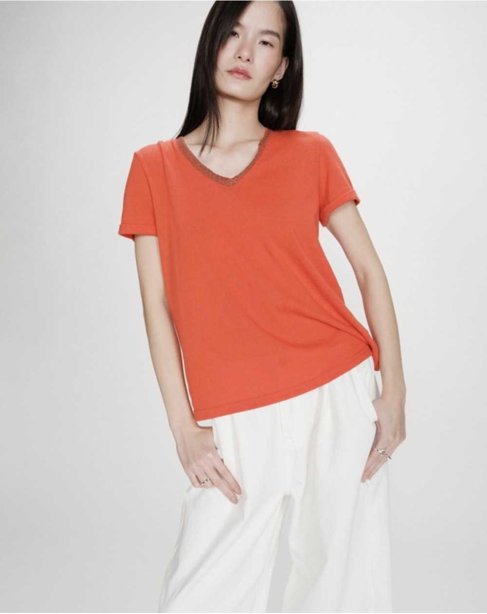 -shirt emblématique de G&M, pensé comme un essentiel du vestiaire.Il se distingue par son encolure en V soulignée de lurex et ses manches courtes à revers, pour une touche discrète et raffinée.