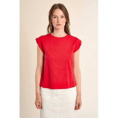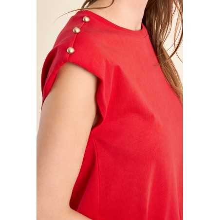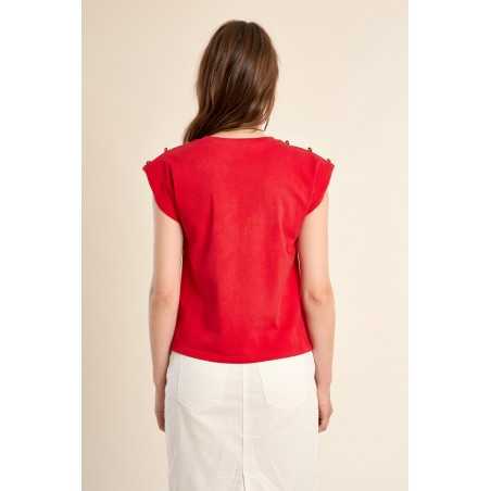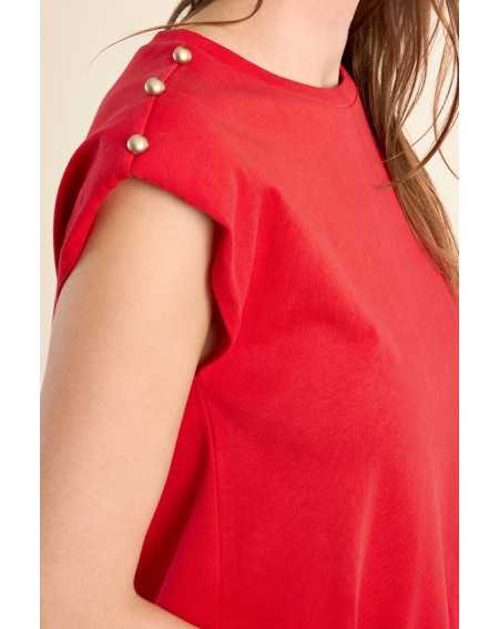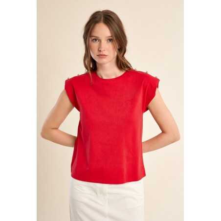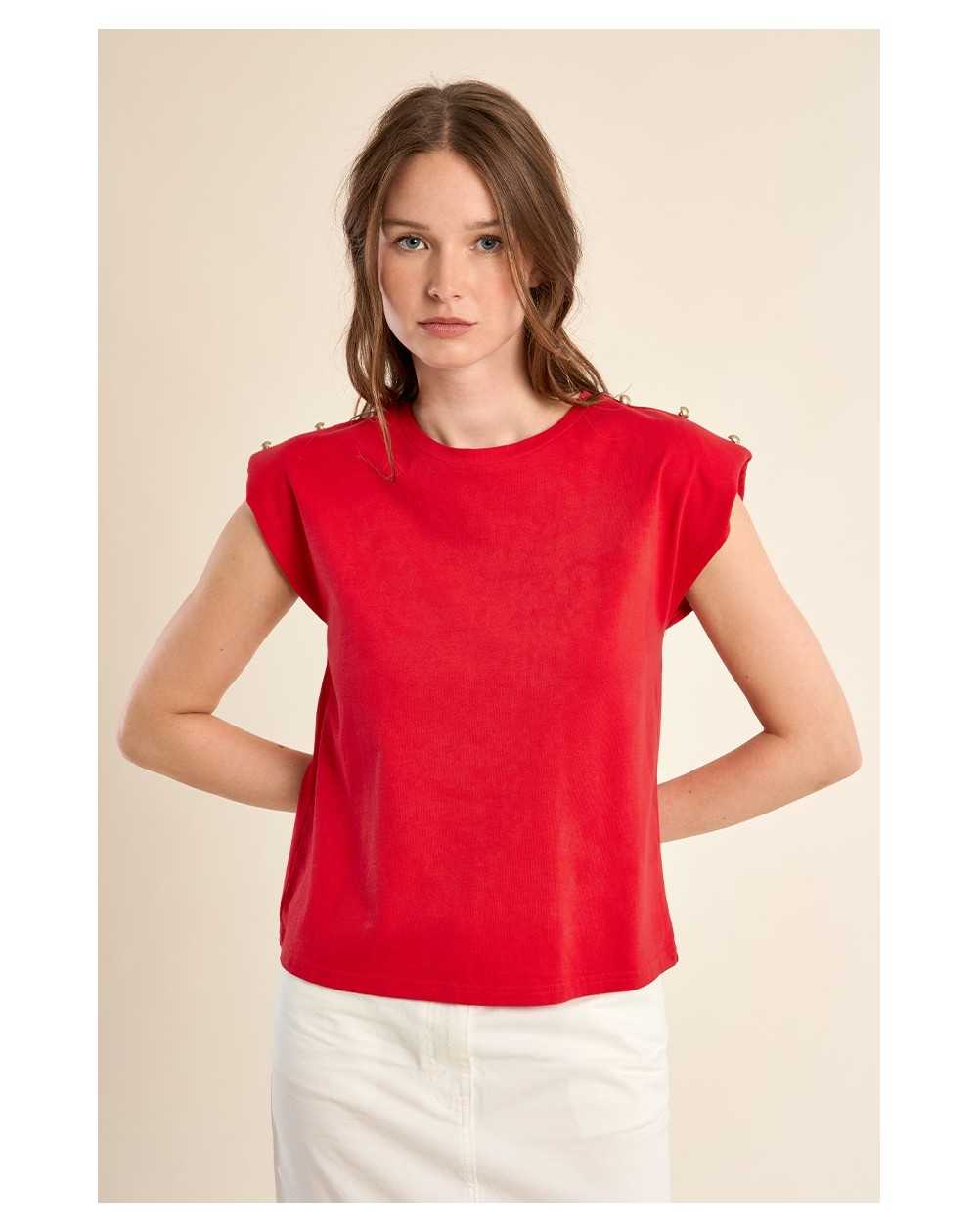 T-shirt à épaulettes rehaussé de boutons dorés, pour une allure structurée et élégante. Sa coupe droite et son col rond en font une pièce facile à porter au quotidien.