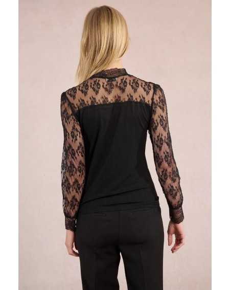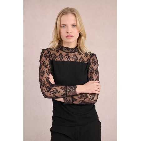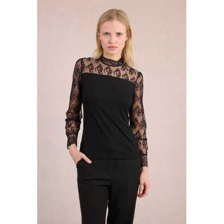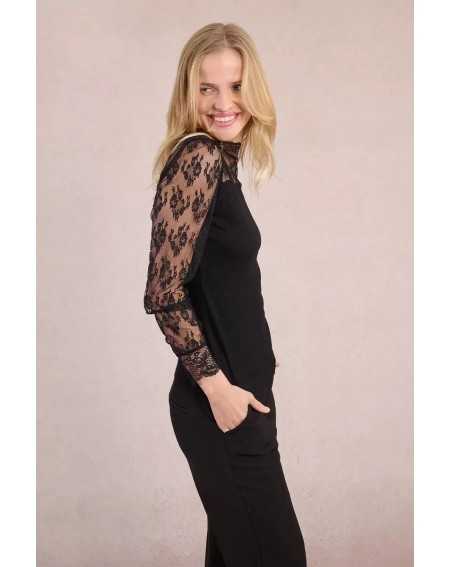 Élégance et subtilité pour ce pull fin à la coupe ajustée, mêlant délicatement maille douce et manches en dentelle transparente. Les poignets fantaisies et le col semi-montant complètent son allure féminine et sophistiquée.