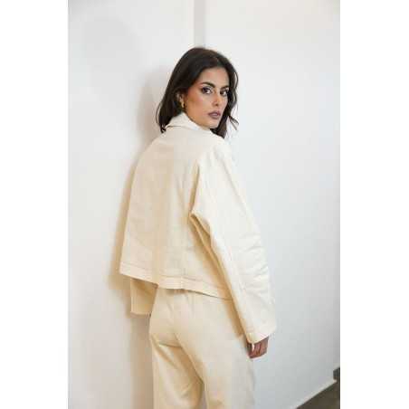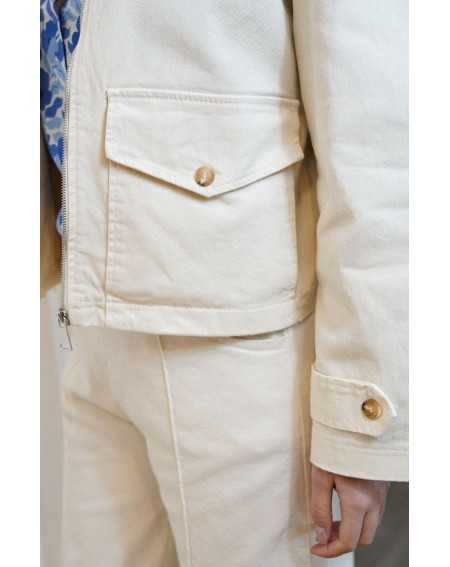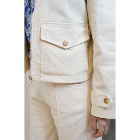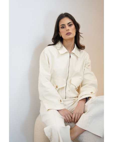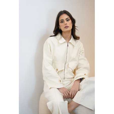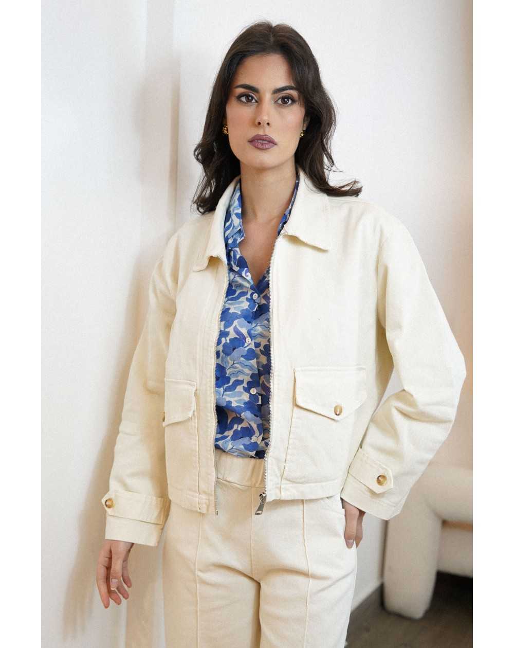 Veste courte au style moderne et structuré. Sa coupe légèrement ample, sa fermeture zippée et ses poches à rabat lui apportent une touche casual tendance.