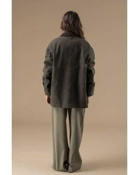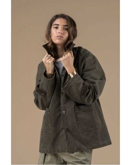 Couleur kaki foncé, avec un effet légèrement vieilli, ce qui lui donne un aspect authentique et vintage. Sa matière est en coton épais robuste et résistante — parfaite pour l'extérieur. Sa coupe droite et ample offre une bonne aisance de mouvement. Fermeture boutonnée à l’avant avec des gros boutons ronds visibles. Deux grandes poches plaquées sur le bas. Détail en suédine marron au niveau des poignets, avec boutons décoratifs, pour un look travaillé jusque dans les finitions.
