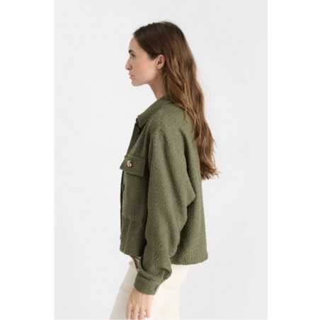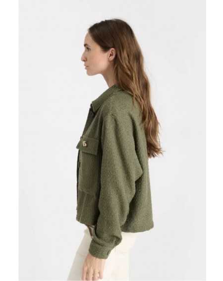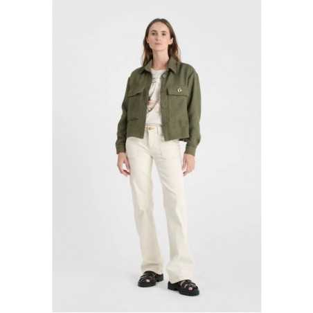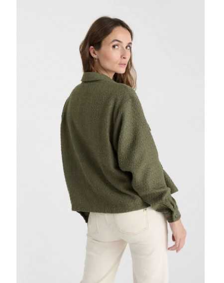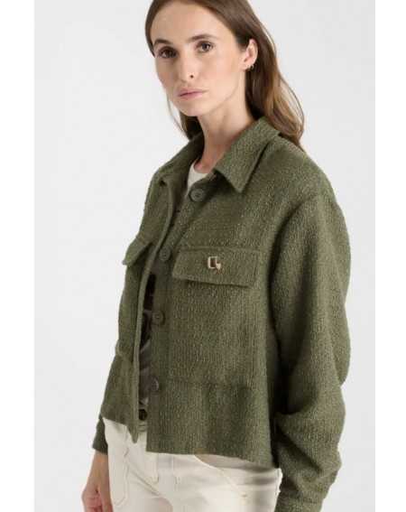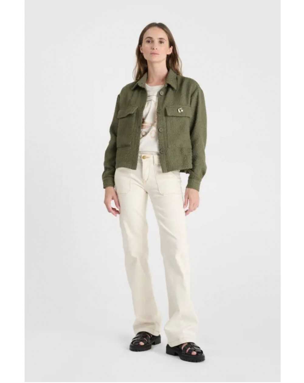 Veste kaki en tweed aux poches plaquées, broche amovible monogramme dorée.