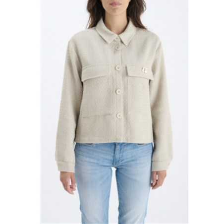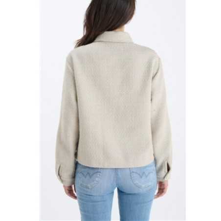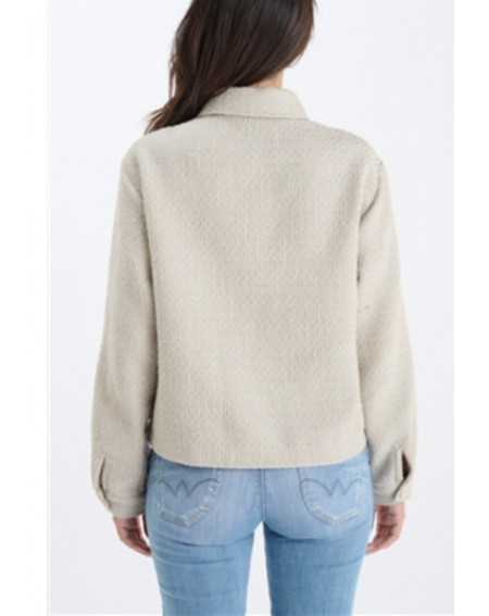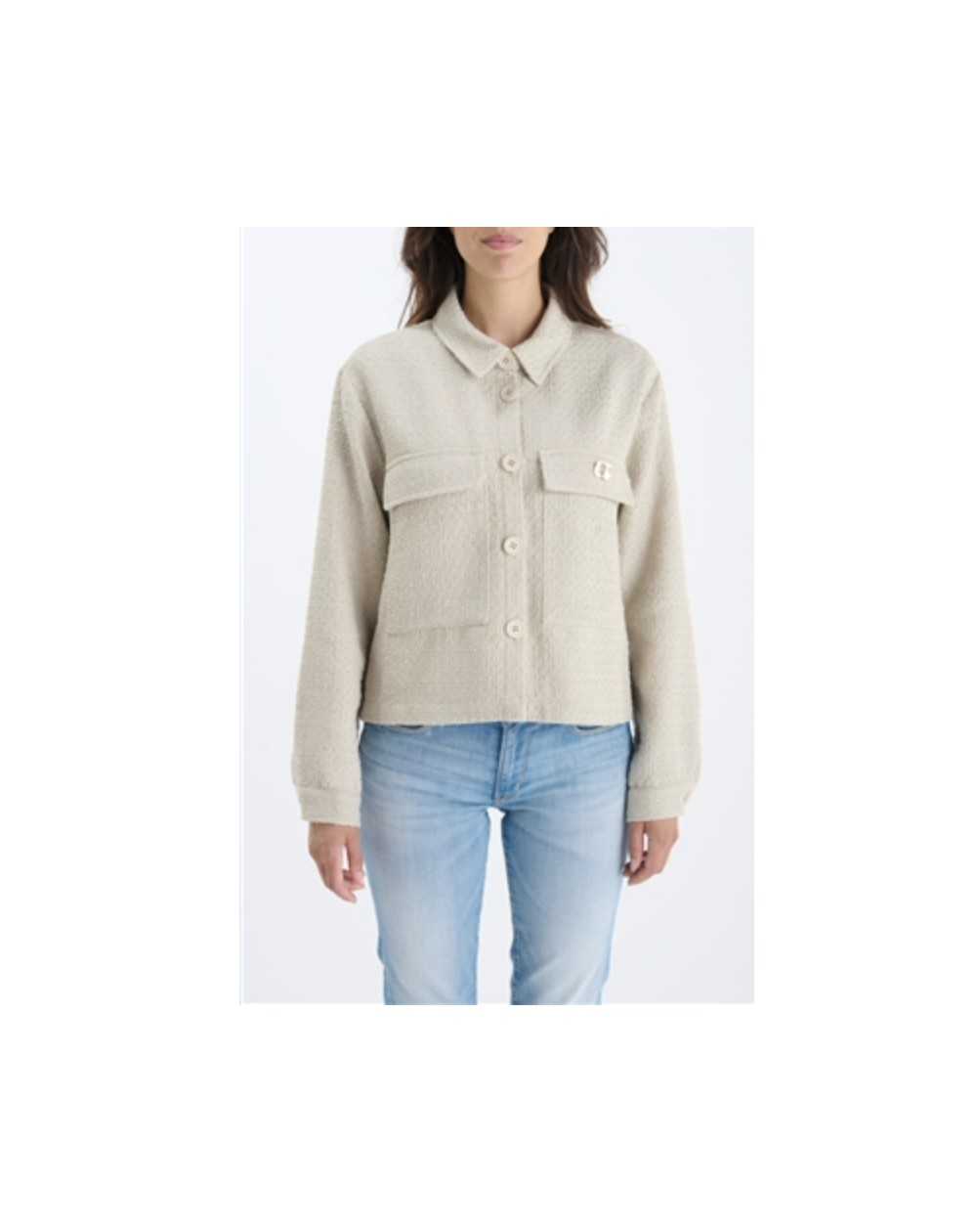 Veste kaki en tweed aux poches plaquées, broche amovible monogramme dorée.